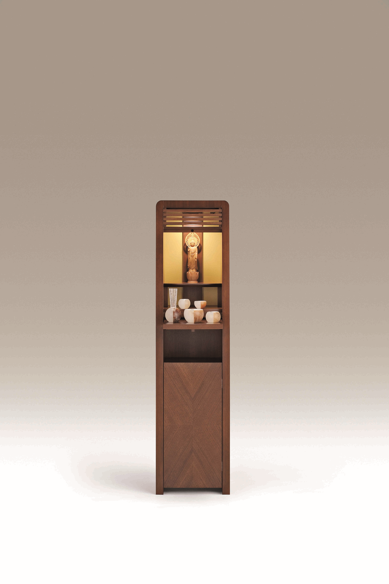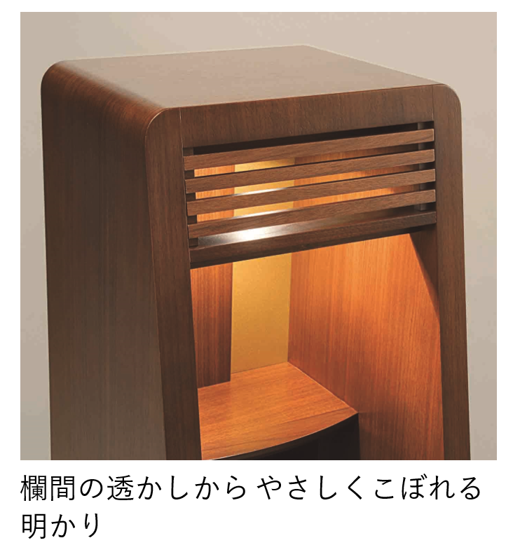シャープな矢貼りの扉を頭の丸みが和らげたスリムサイズの仏壇です。