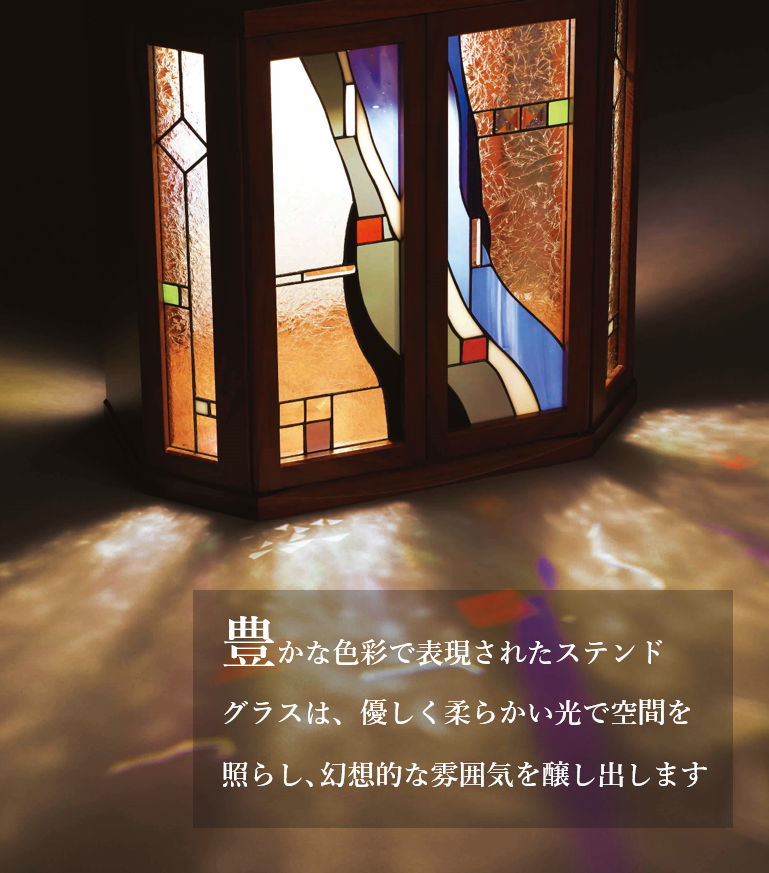 豊かな色彩で表現されたステンドグラスは柔らかい光で空間を照らし幻想的な雰囲気を醸し出します。