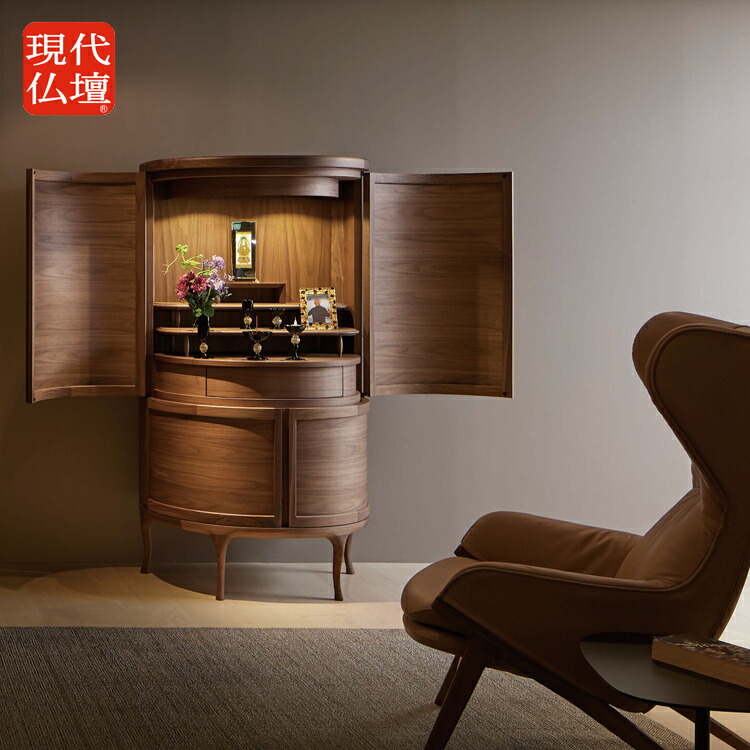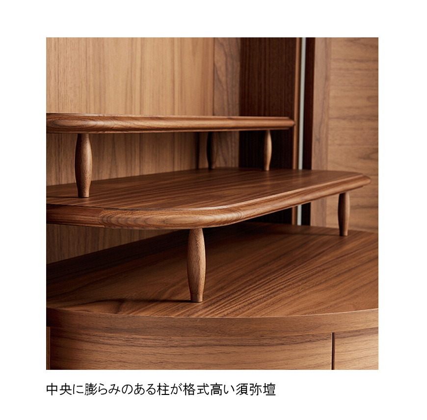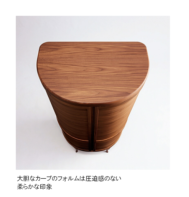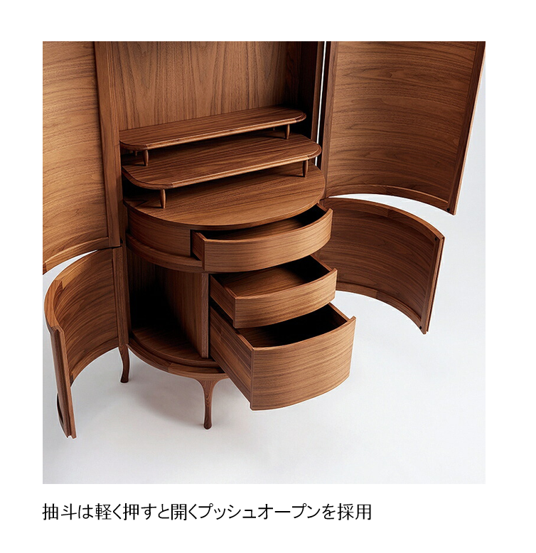 ダイナミックな曲面構成の扉を開けると優美な杢目が横へ広がり悠久の時を経た巨樹に抱かれる心地がします。