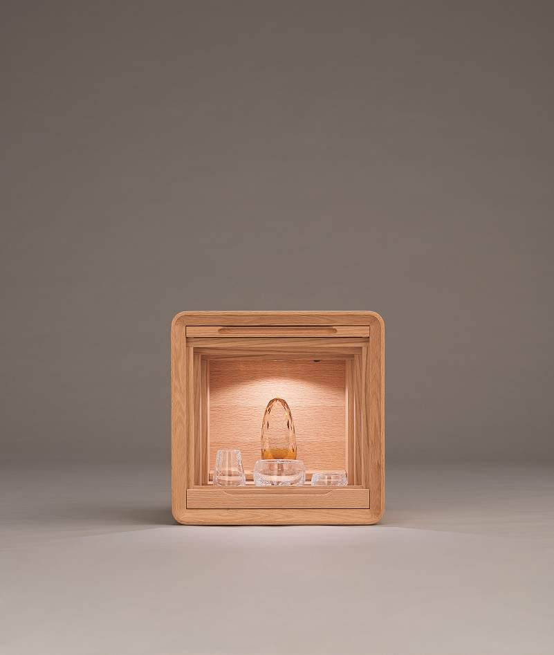無垢材を削り出して角に丸みをつくり、奥へと続く階段状に仕上げました。