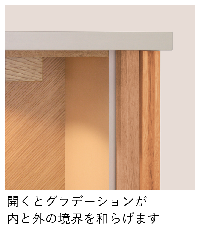 オシャレな矢貼りの扉は開けるとサイドにスッキリと収まり、省スペースです。
