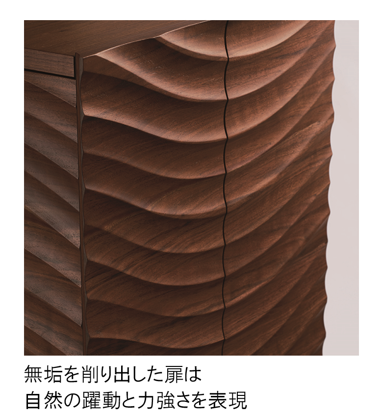 扉の彫刻はゆったりとした波や水の流れをイメージ。