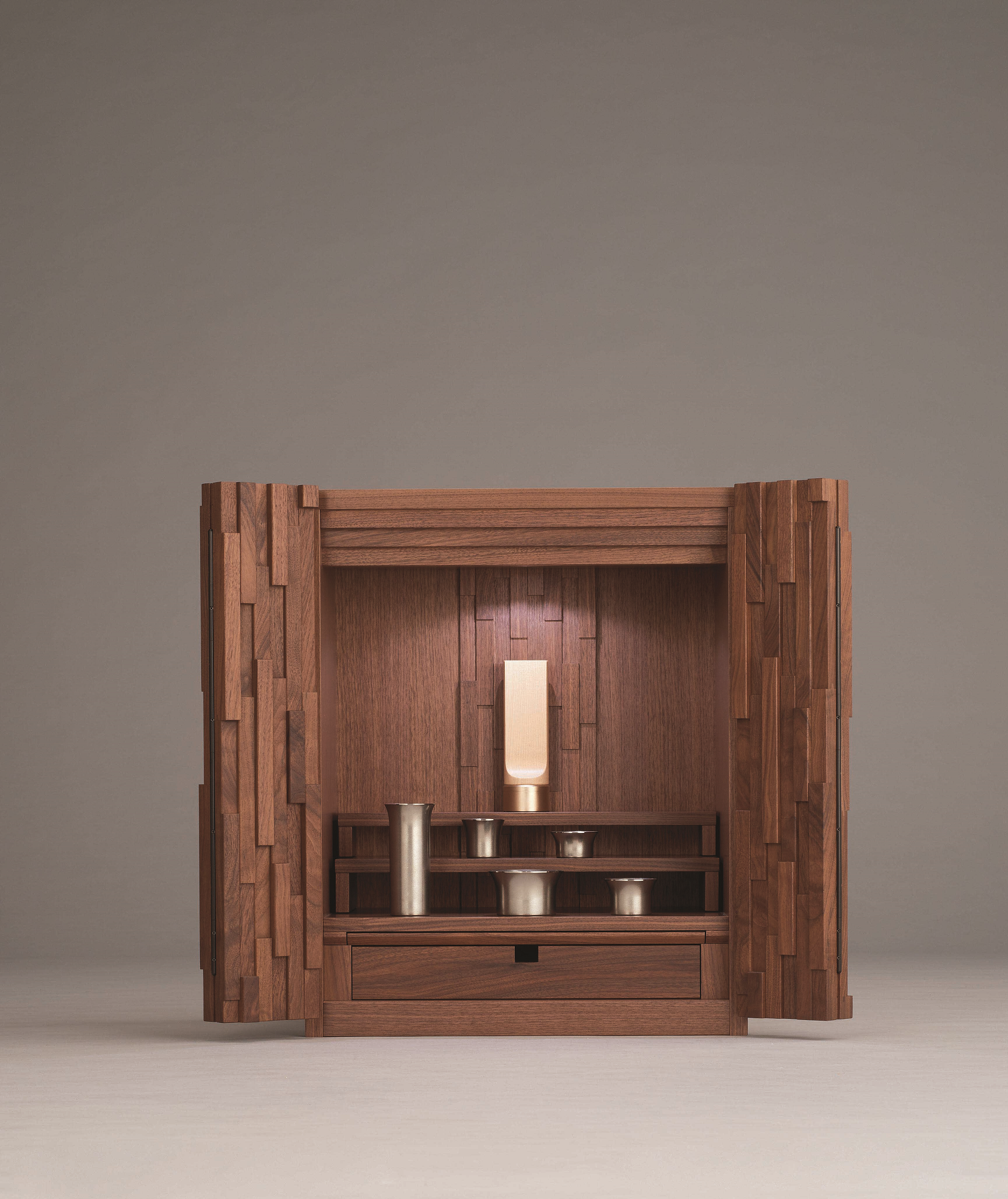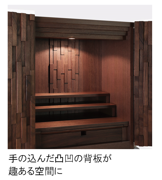 ウォールナットの無垢材を贅沢に寄せ合わせたランダムデザイン。
