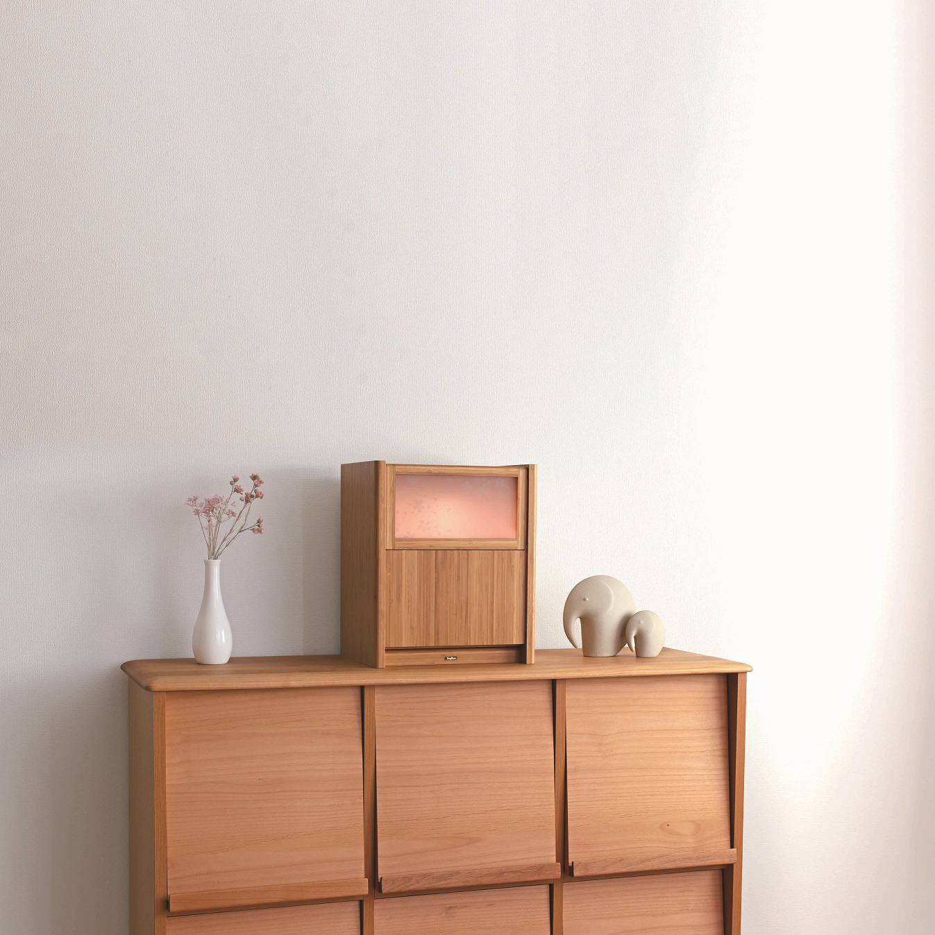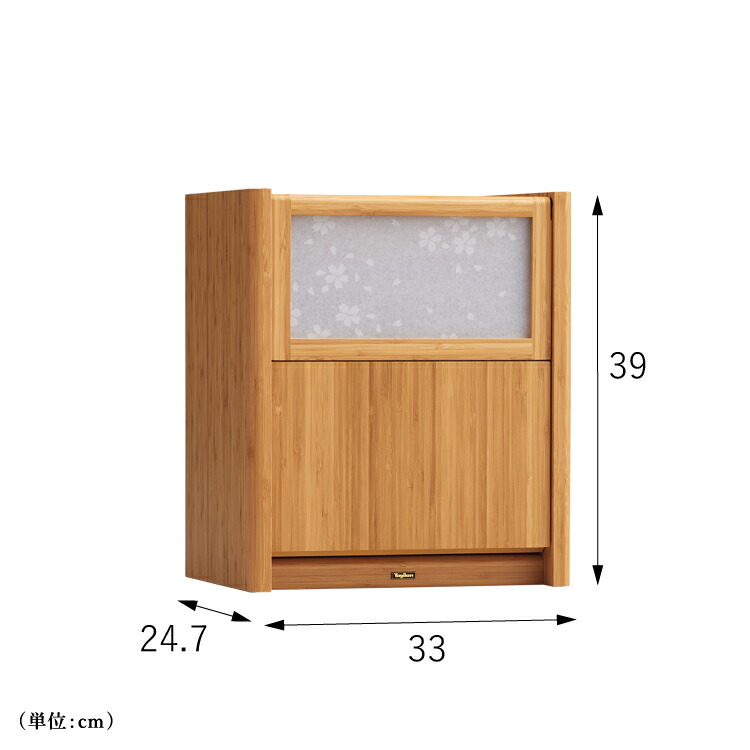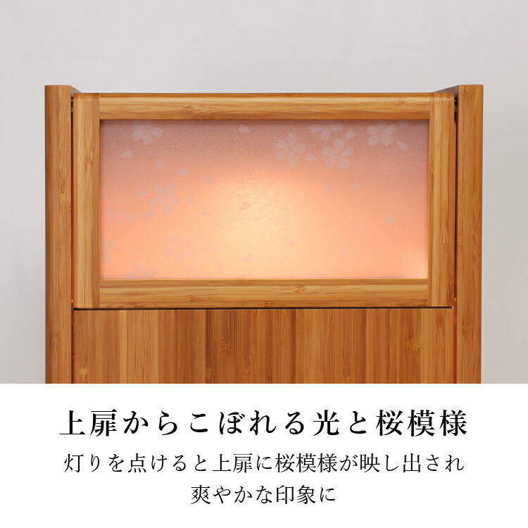 光に映る桜模様が爽やかな扉は、跳ね上げ式で幅を取りません。